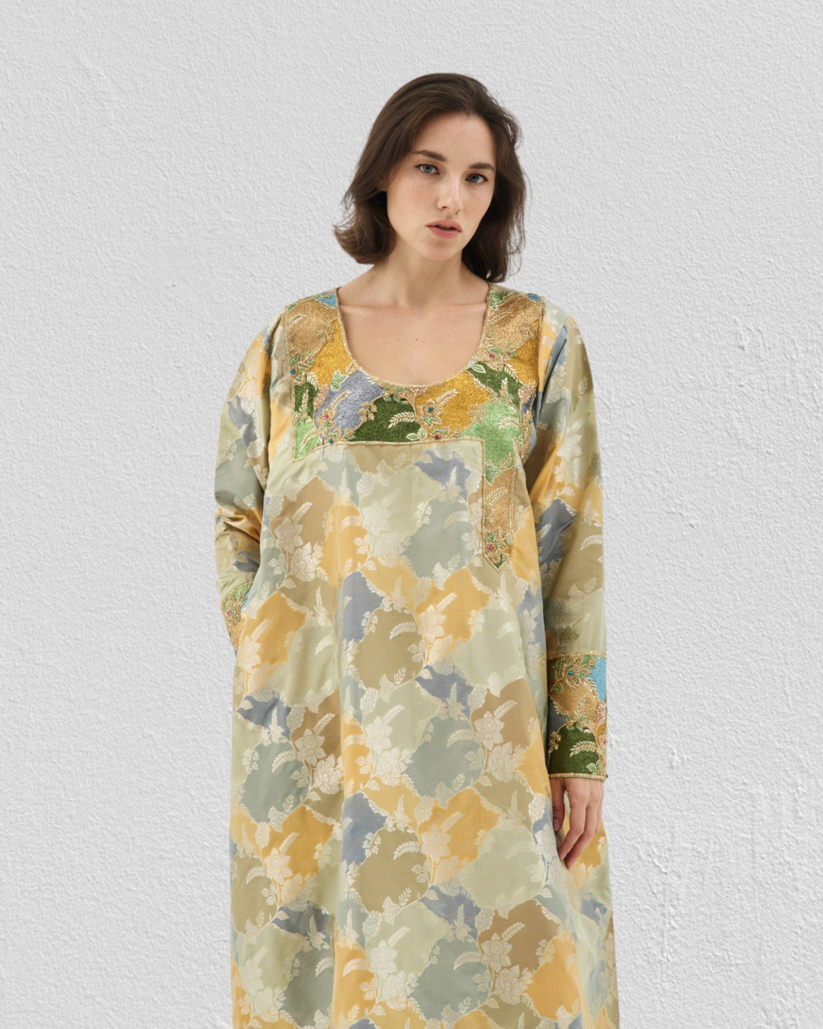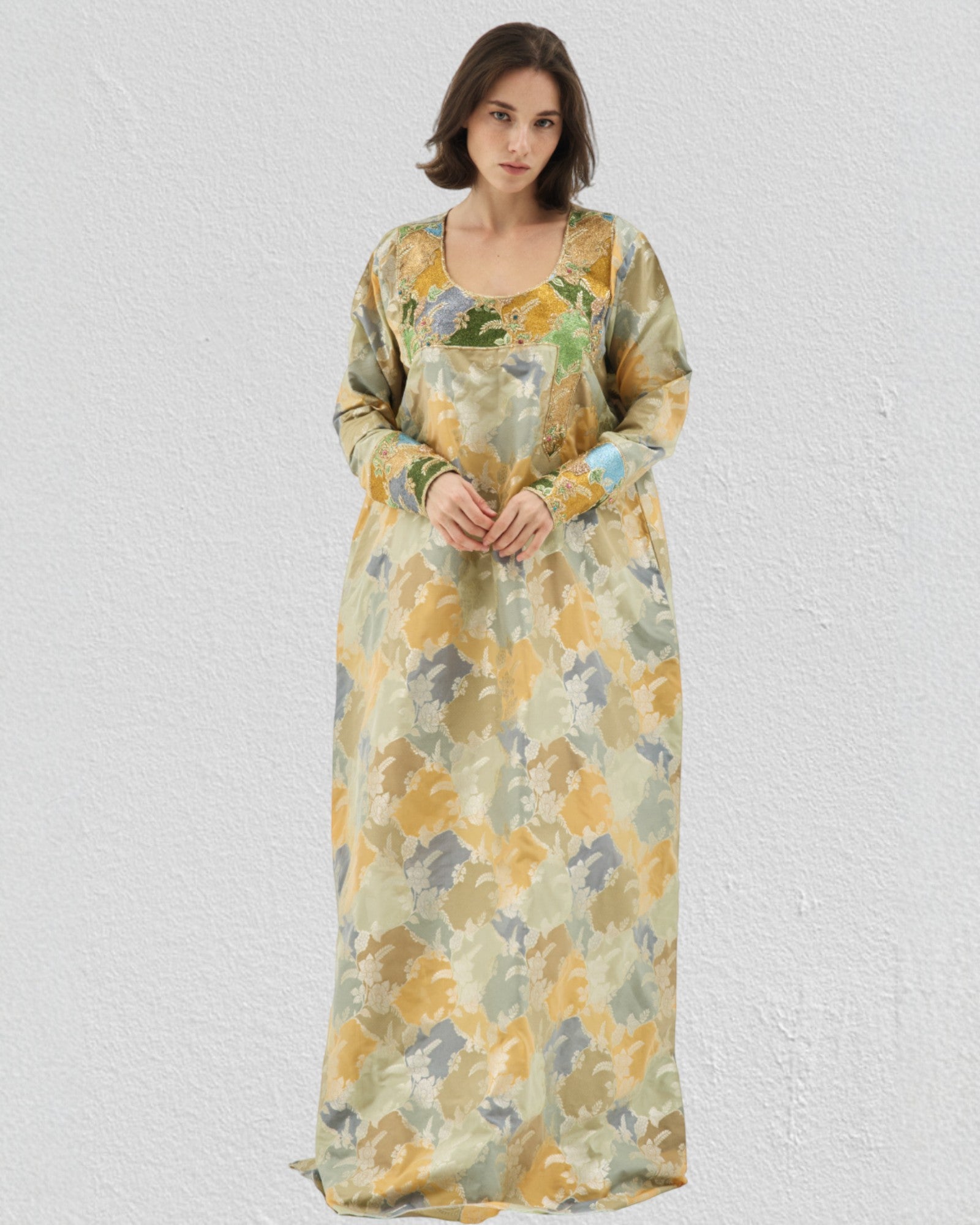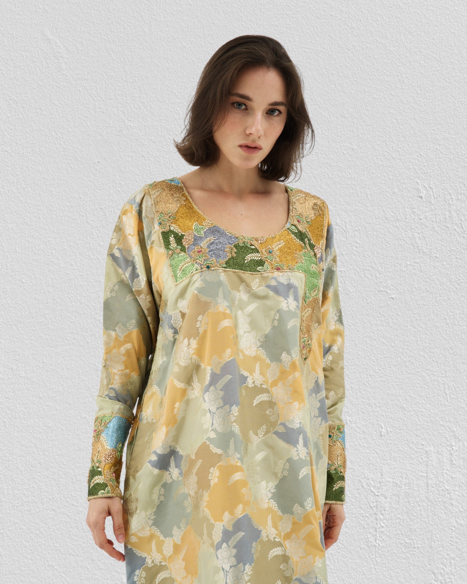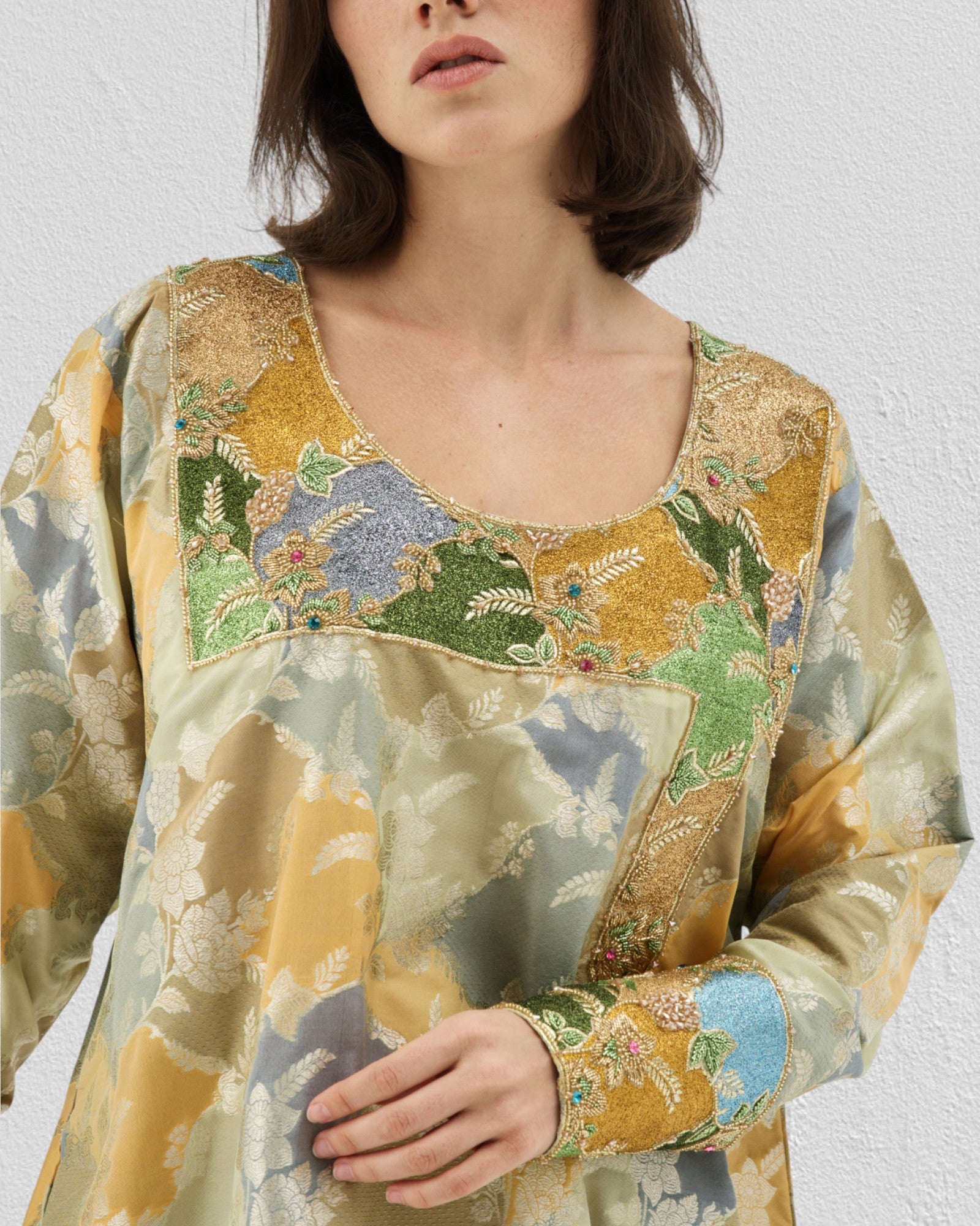 تتميّز هذه القطعة الفريدة بطبعة خوص تقليدية مع شك يدوي دقيق على حرير هندي فاخر، مما يمنحها لمسة أنيقة ومميزة تناسب مناسباتك الخاصة بكل فخامة ورقي. استمتع بجودة الأقمشة والتفاصيل الحرفية التي تعكس ذوقًا راقيًا وتفردًا لا مثيل له.